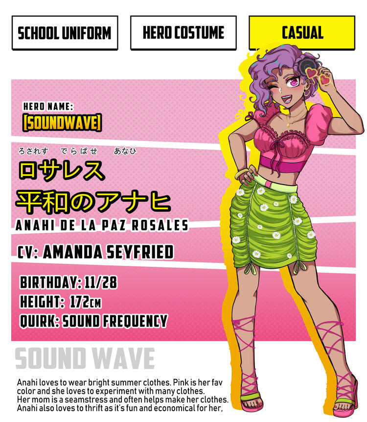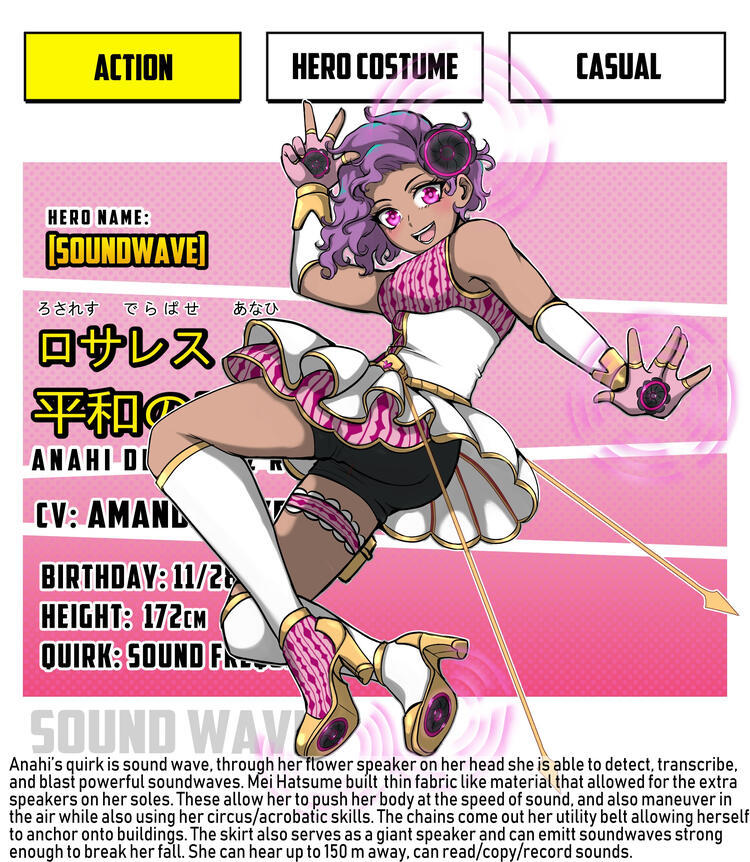 Her design is my favorite among all my characters and often I use her in my store and business cards.I draw her a lot so enjoy the majority of art pieces I have created of her.Her super power is Sound wave an is somewhat similar to Present Mic but more like a satellite and also super hearing