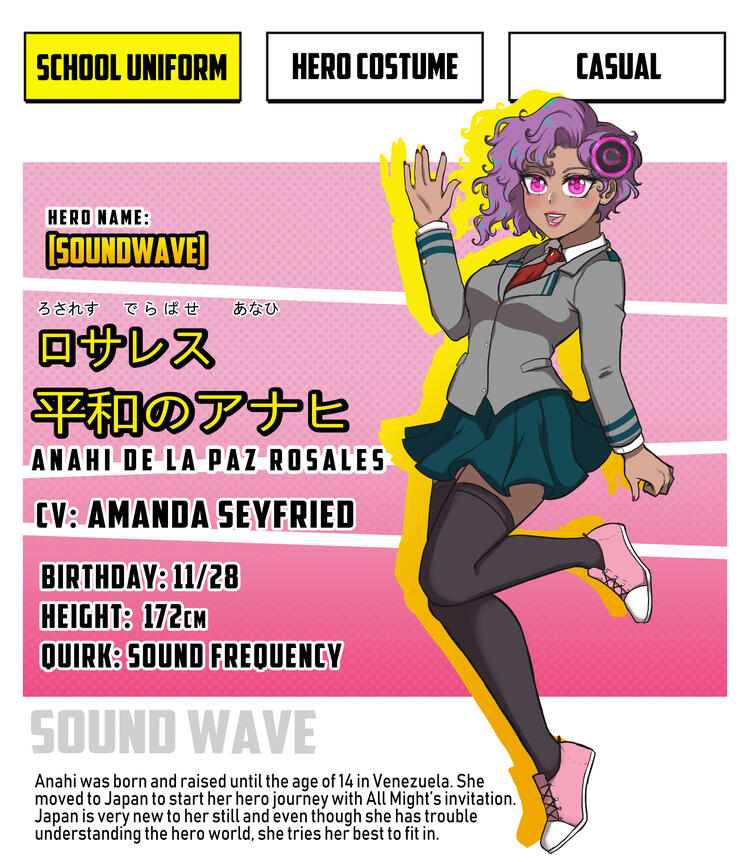 Her design is my favorite among all my characters and often I use her in my store and business cards.I draw her a lot so enjoy the majority of art pieces I have created of her.Her super power is Sound wave an is somewhat similar to Present Mic but more like a satellite and also super hearing